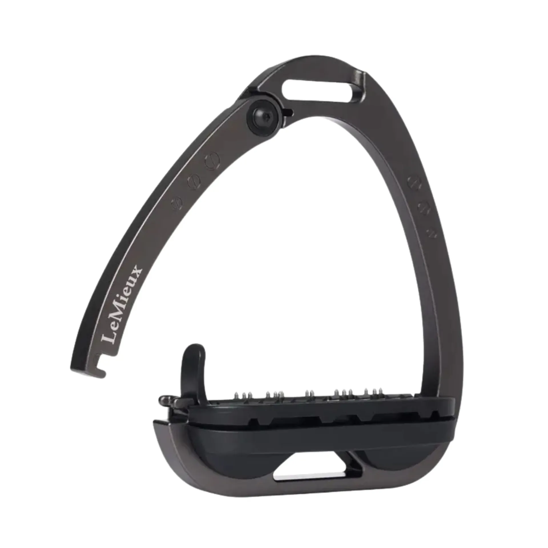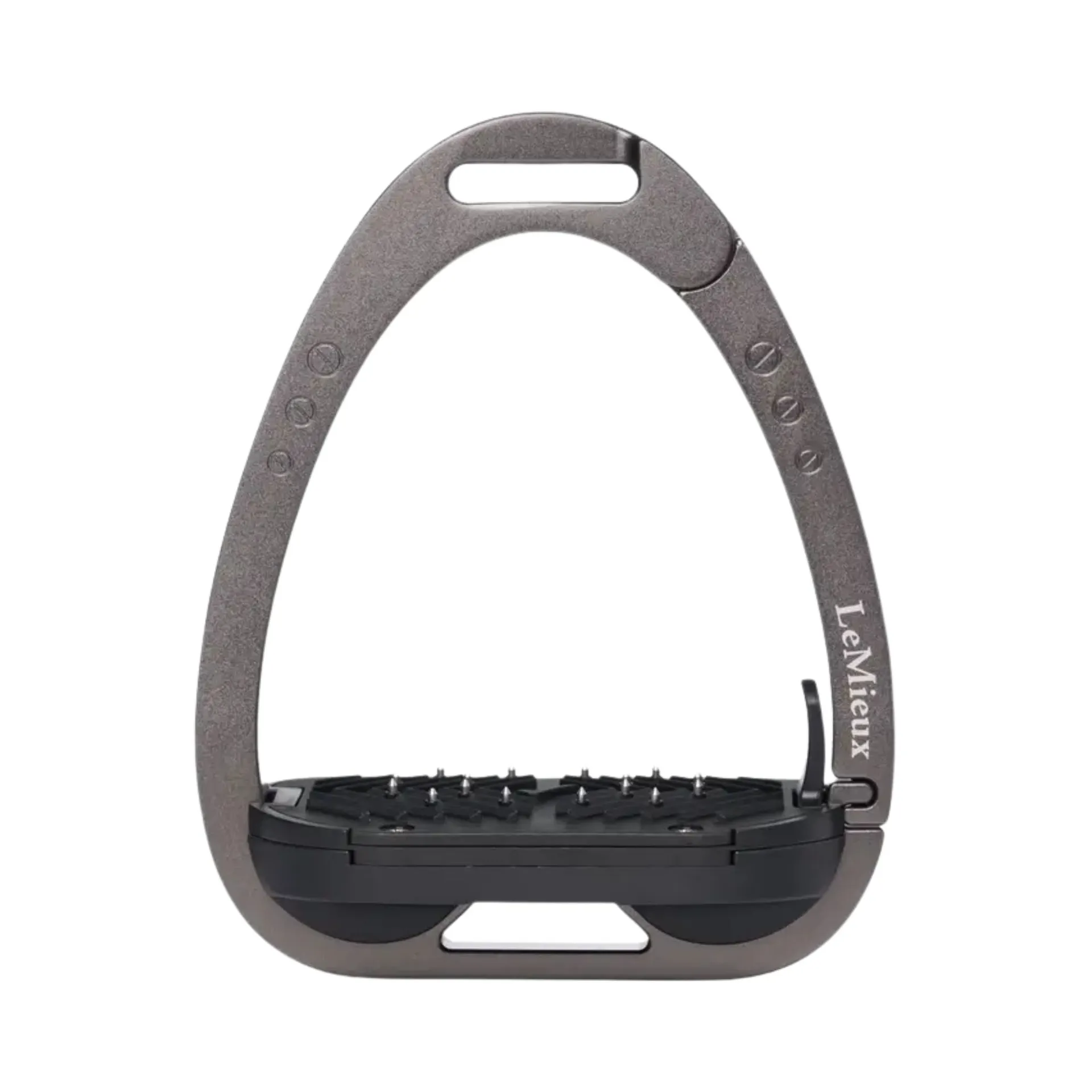 The footplate is supported by a twin-balance arch system that distributes the weight evenly across the base of the stirrup frame. The apex of the frame is recessed and off-set, encouraging a 45° outward orientation which makes it easier for the rider to locate the optimum angle for the foot and regain a lost stirrup.