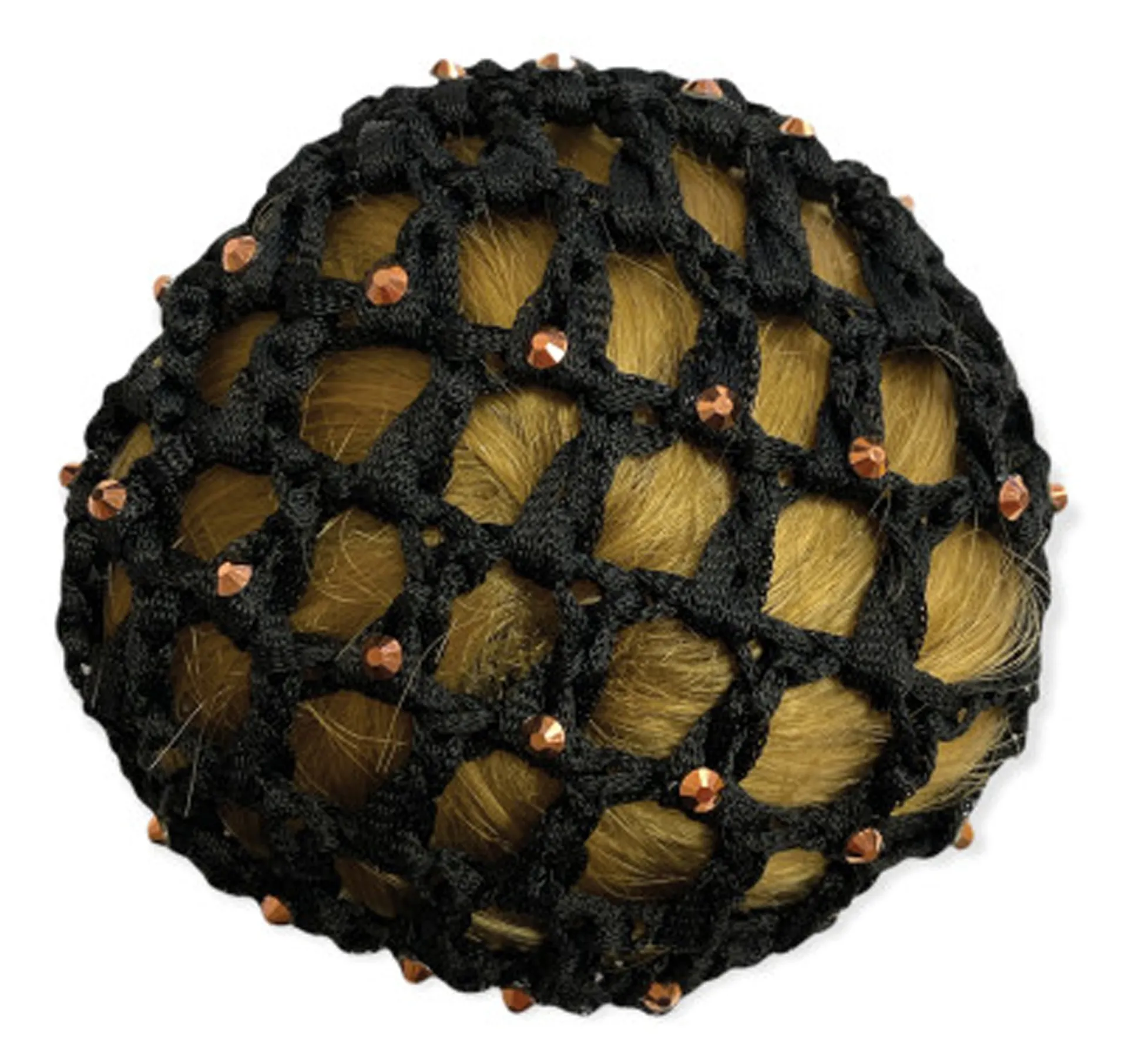This bun net features an elasticated design with Rose Gold embellishments. It is made from Raylon + trims.
