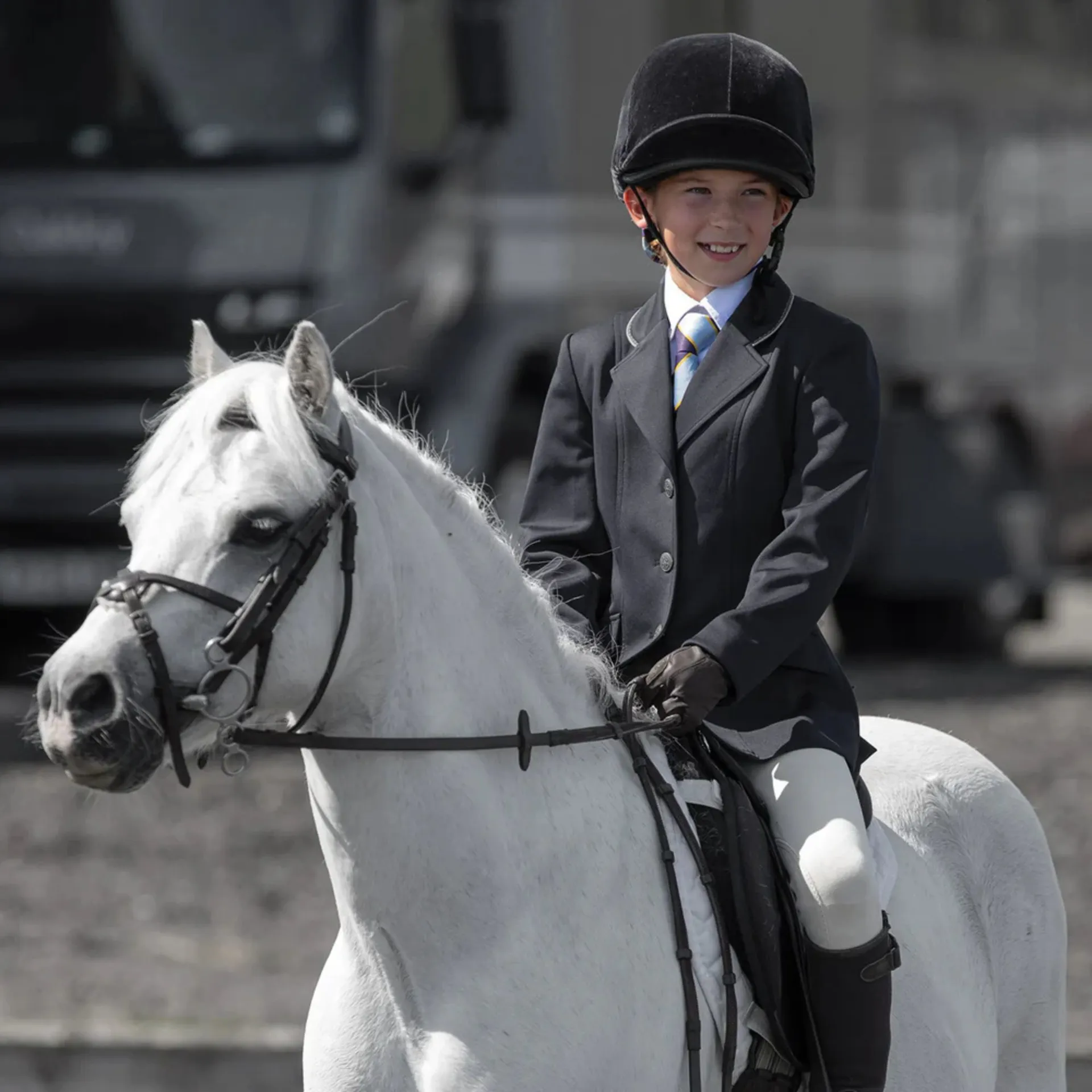 Classical tailored competition jacket with modern elements.