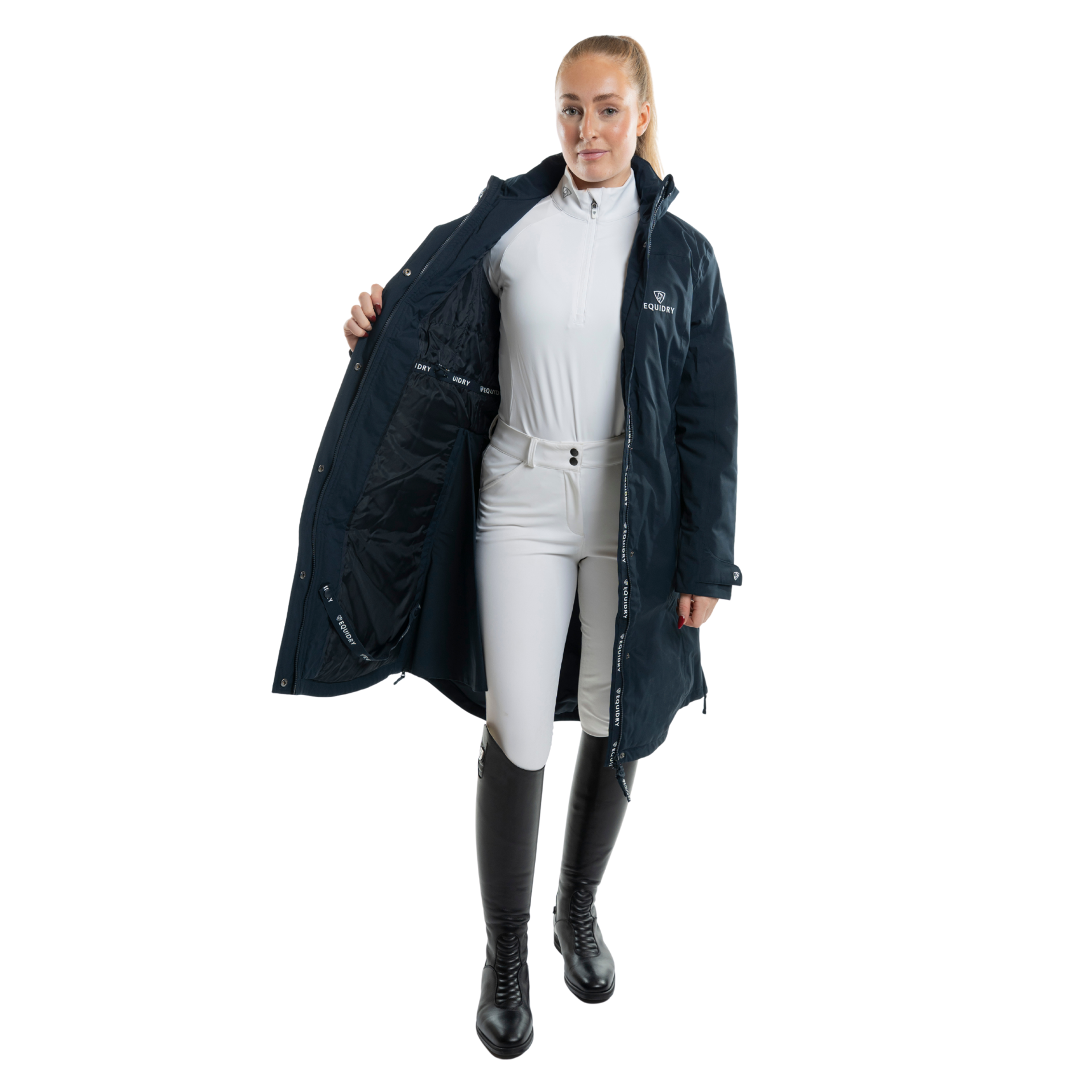 Choose The Equidry New Women’s Bronte Riding Coat with Removable Hood in Navy if you want a premium equestrian coat that performs as beautifully as it looks. Designed specifically for riders, it offers full-length coverage, superior waterproofing and breathable comfort without sacrificing a flattering, feminine fit. With practical storage, adjustable features and eco-conscious PFC- and PFAS-free waterproofing, this coat is ideal for riders who want dependable protection, long-lasting quality and timeless style all year round.