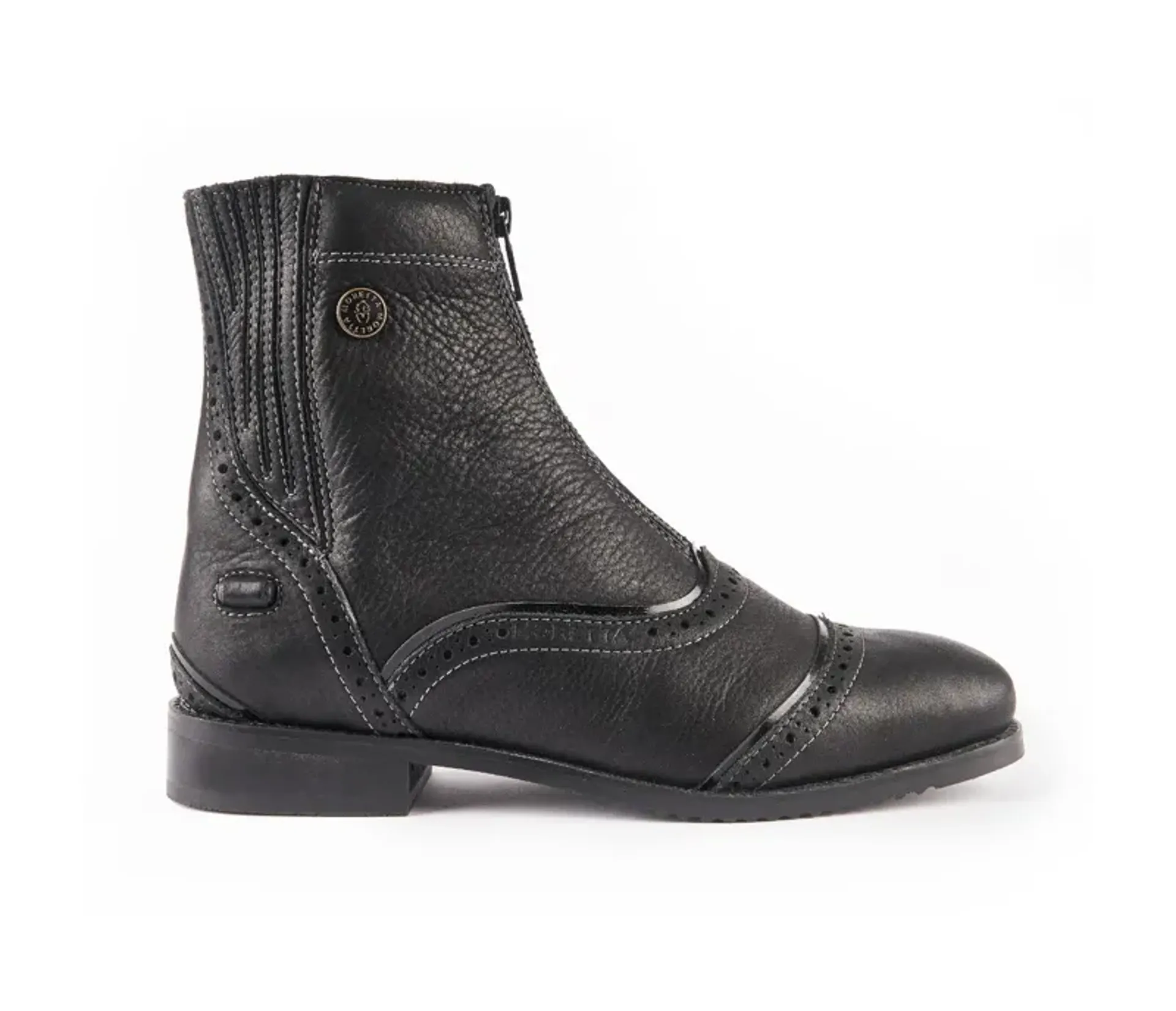 Premium zipper opening paddock boots with brogue and patent detail.