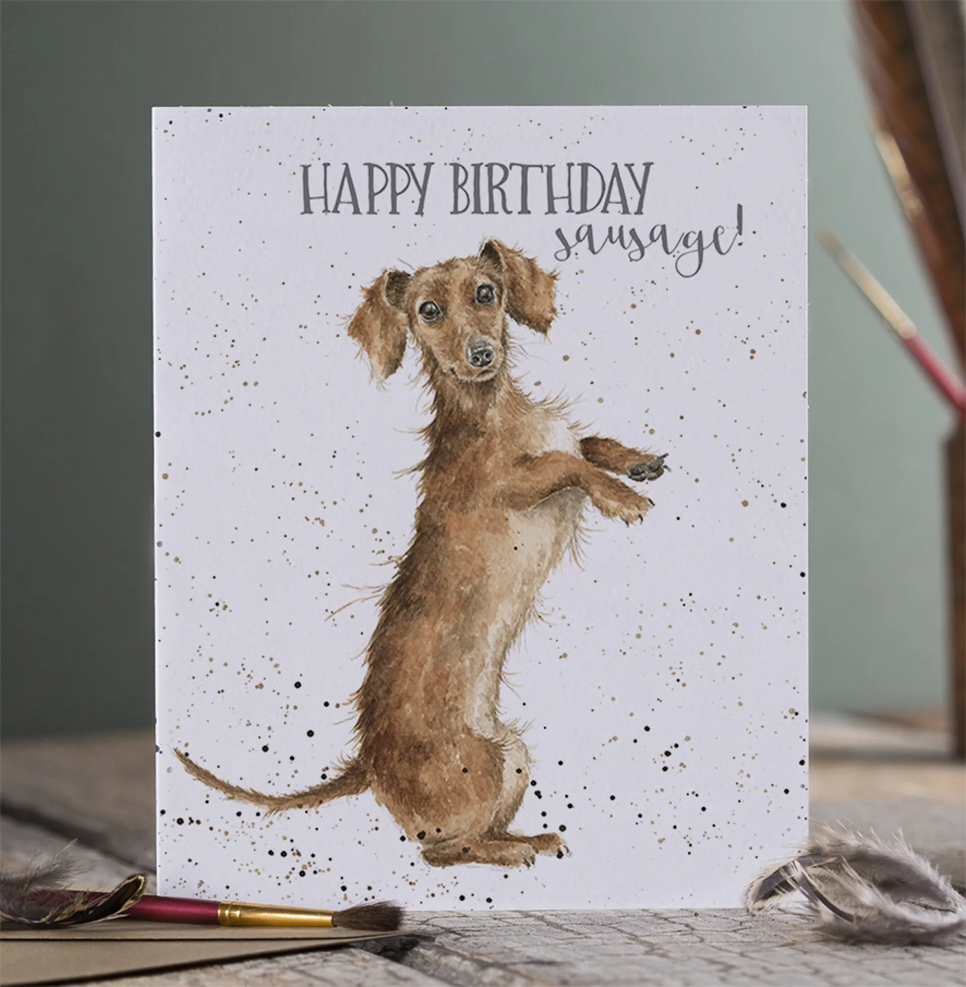 Wish someone a Happy Birthday with this card featuring a lovely little Dachshund and reads, 'Happy Birthday Sausage!'. The image is printed on sustainably sourced textured board and is supplied with a recycled kraft envelope. Measures 170mm x 138mm.