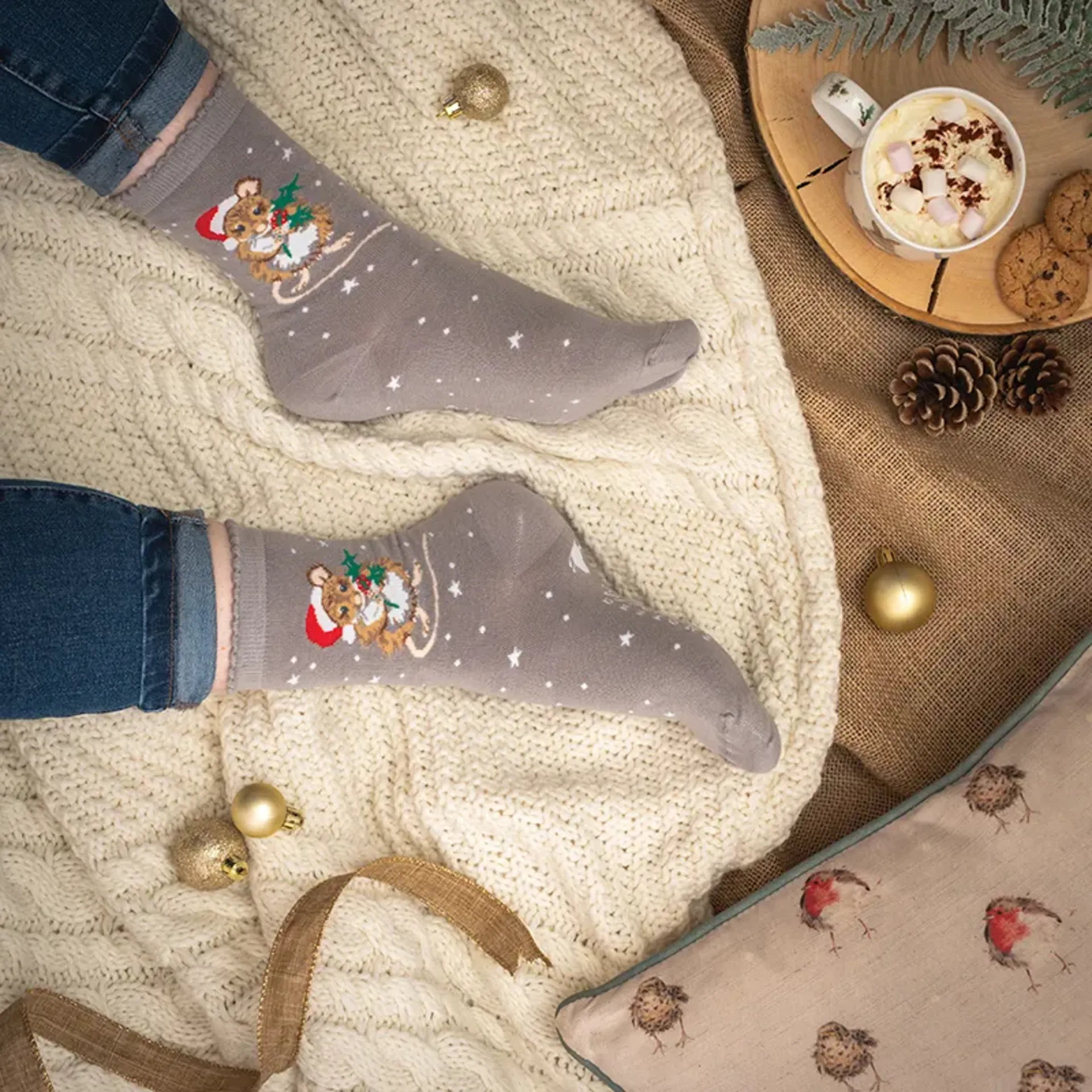 A festive treat for your feet, this wonderful pair of socks features a delightful mouse stitched onto super soft bamboo material. As well as being naturally warm and super soft, our socks are kind to the environment too. One size (women's 4–7). Viscose derived from bamboo with nylon stitching. Machine washable. Each pair of socks comes with a beautifully illustrated gift bag making a wonderful gift.