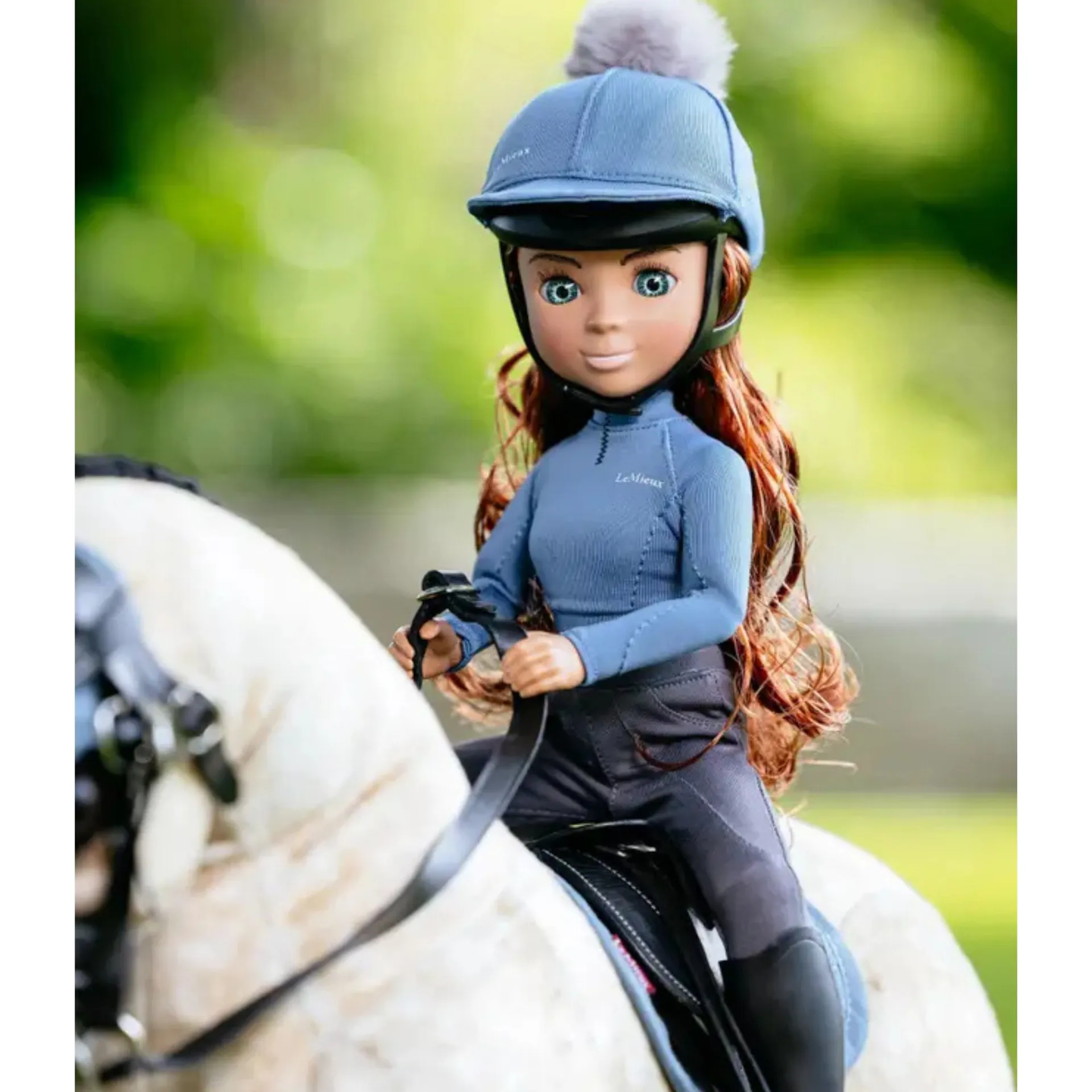 This interactive, fully articulated, high-quality equestrian doll has a unique personality and matching outfit in LeMieux core colours. Olivia features luscious, real-feel, brushable long chestnut hair and natural eyelashes. She comes wearing removable replica LeMieux riding wear in Ice Blue, with a removable riding helmet and boots.