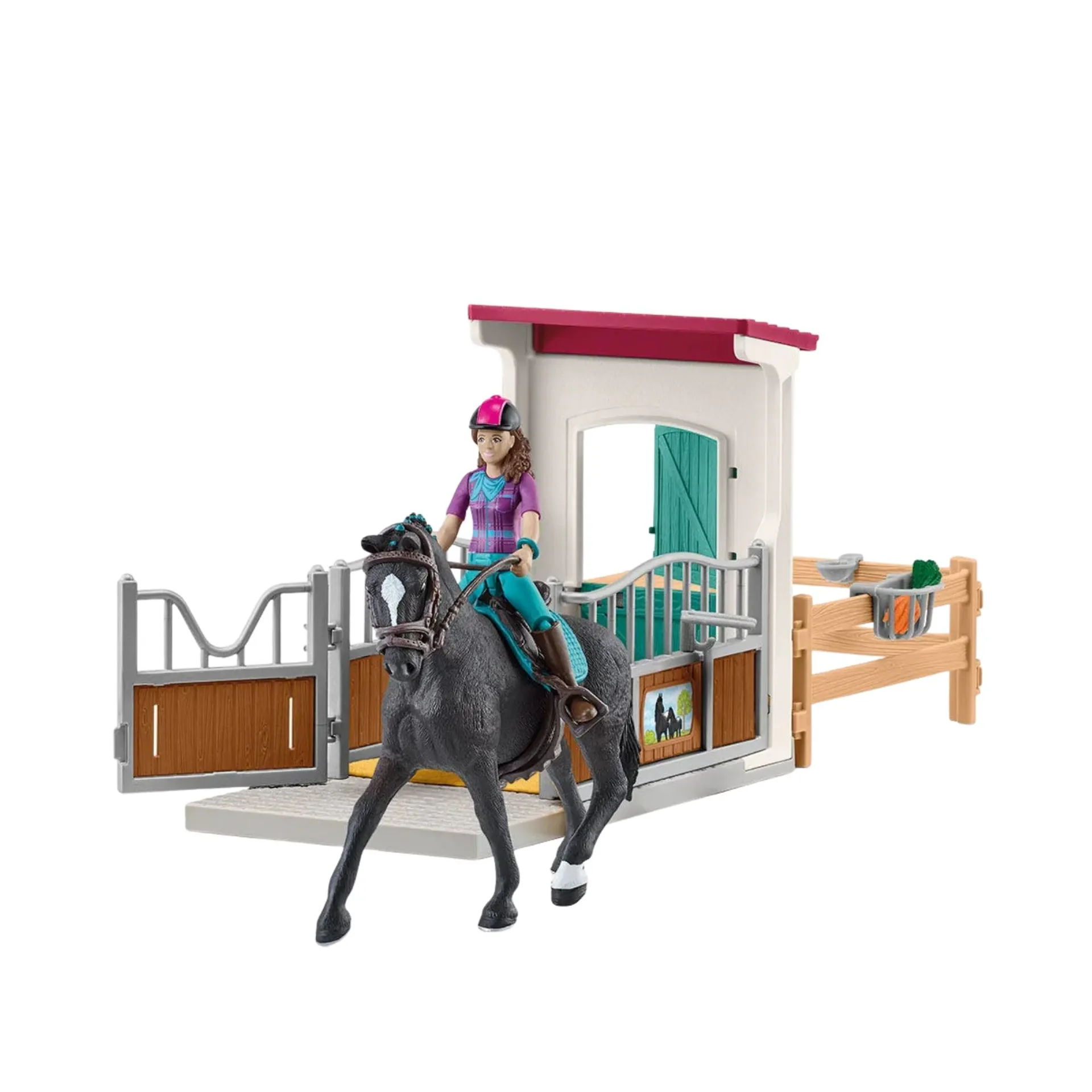 1x horse box, 1x girl, 1x Horse, 1x saddle, 1x bridle and reins, 1x hay rack, 1x hay, 3x paddocks, 1x trough, 2x carrot, 1x helmet, 1x sticker sheet, 1x assembly instructions