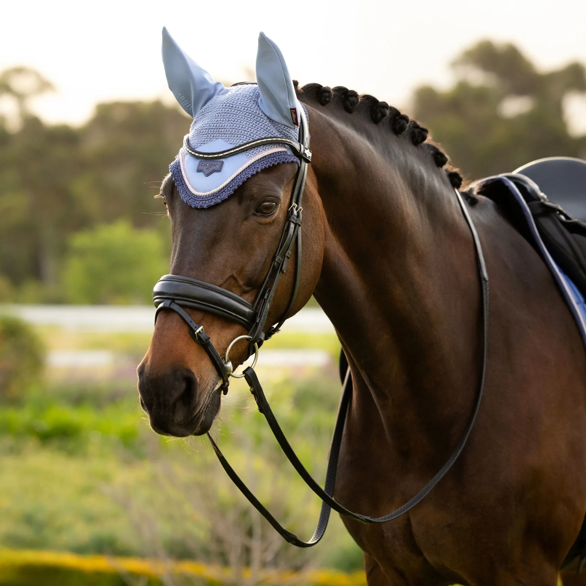The LeMieux Loire Fly Hood in Powder Blue is the perfect blend of luxury style and practical performance, designed to complement your horse’s wardrobe while providing essential protection.