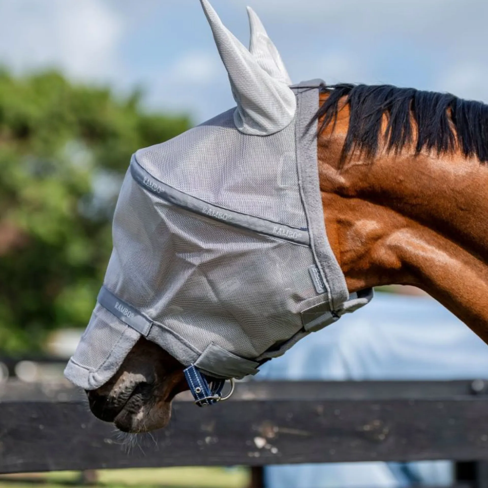 TheRambo® Fly Maskoffers dual protection during summer turnout, offering the ultimate protection against flies and the damaging effects of sunlight. The Horseware improved design gives optimum UV eye protection without impairing vision courtesy of our unique eye guard feature.