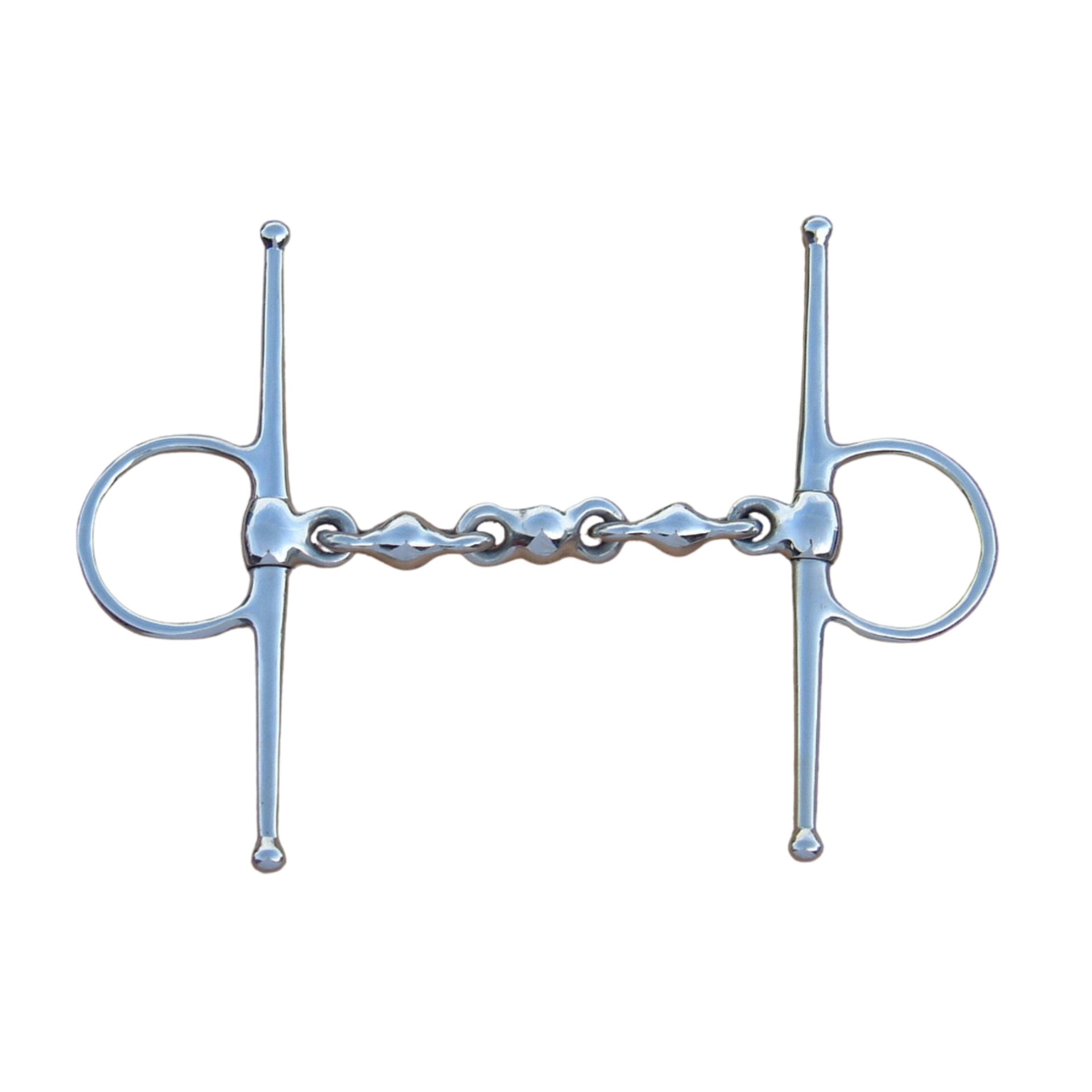 This full cheek bit has a chain type mouthpiece which has ball shaped links linked together.