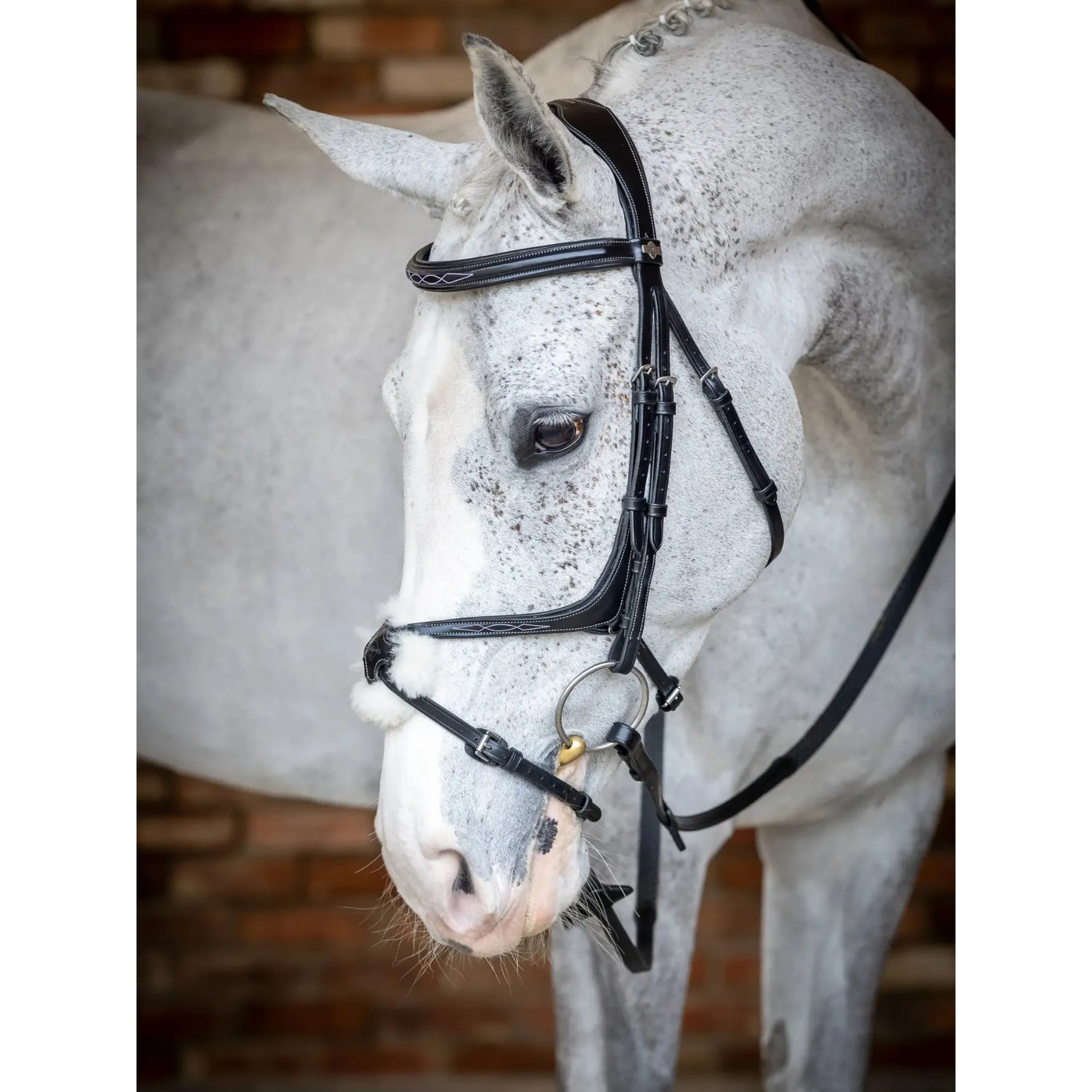 It comes with interchangeable padding at the back of the nosepiece with the option of merino wool or a soft leather cushion. A featured D-ring on noseband allows the pieces to sit smoothly against the horse's cheeks and jaw. This helps to provide a tailored fit for different jaw shapes and the back strap can move independently.